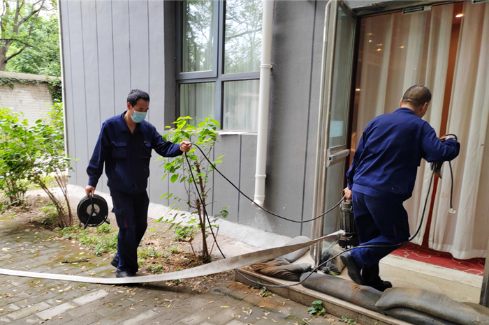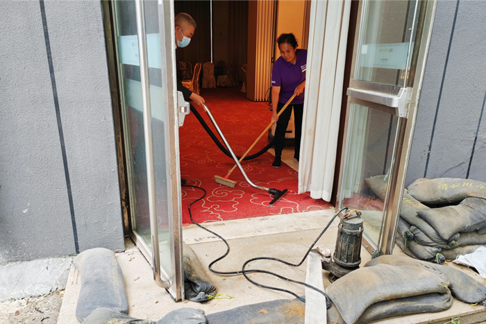 接到指令的工程部人員攜帶搶險排澇設備:潛水泵、防水線軸、排水水帶趕到現場,迅速開展排澇搶險工作;接到搶險指令的客房部人員攜帶吸水機、舊布草、拖把隨即到達現場,對室內殘存的積水進行了處理。最終,在參與搶險的各部門人員的通力合作下,“內澇險情”得到了有效控制,保護了酒店財產不受損失。此次演練圓滿成功,達到了預期效果。
