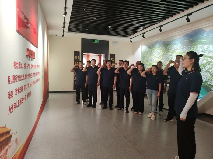 凜然先輩骨,濃濃雁翎情。在黨旗面前,全體黨員莊嚴宣誓。在講解員的介紹下,大家認真聆聽白洋淀人民在抗日戰爭期間艱苦斗爭的生活和與敵人浴血奮戰的英雄事跡。一張張照片、一行行文字、一個個實物,沖破歷史的脈絡直抵靈魂。