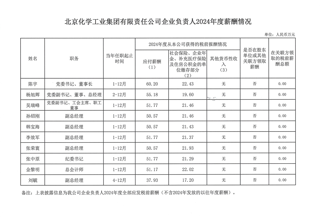 北京化學(xué)工業(yè)集團有限責(zé)任公司企業(yè)負責(zé)人2024年度薪酬情況