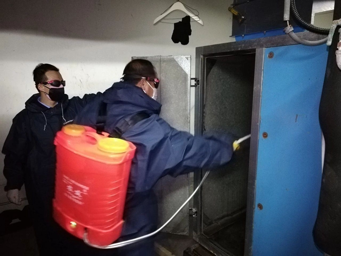 在大廈大堂,公司黨總支書記、總經(jīng)理、副總經(jīng)理、運(yùn)營總監(jiān)現(xiàn)場協(xié)調(diào)指導(dǎo),及時與公司辦公室溝通物資供應(yīng),事業(yè)部班子成員現(xiàn)場指揮調(diào)度,中控操作、樓內(nèi)保潔消毒、空調(diào)消毒、客戶服務(wù)等各方面工作緊張有序推進(jìn)。