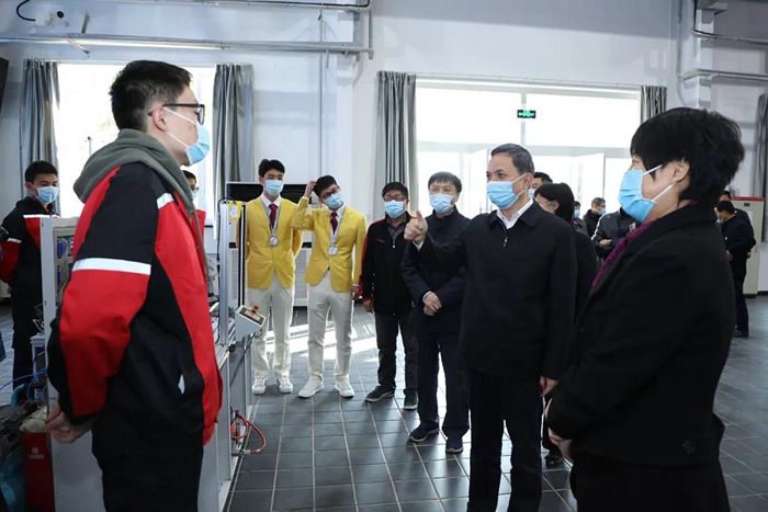 盧彥副市長一行分別來到學院數控實訓現場、世賽集訓基地、沃爾沃培訓中心、奧迪職業學校、智能工廠實訓車間,實地察看了現場教學、選手集訓、職業技能培訓、校企合作等工作開展情況。盧彥副市長詳細了解了學院一體化課程改革、學制技師培養、學生就業發展、世賽基地建設、社會培訓及對口幫扶等工作推進落實情況,仔細詢問了現場學生的學習生活情況,并與備戰第一屆全國技能大賽和第46屆世賽全國選拔賽選手和教師親切交談。