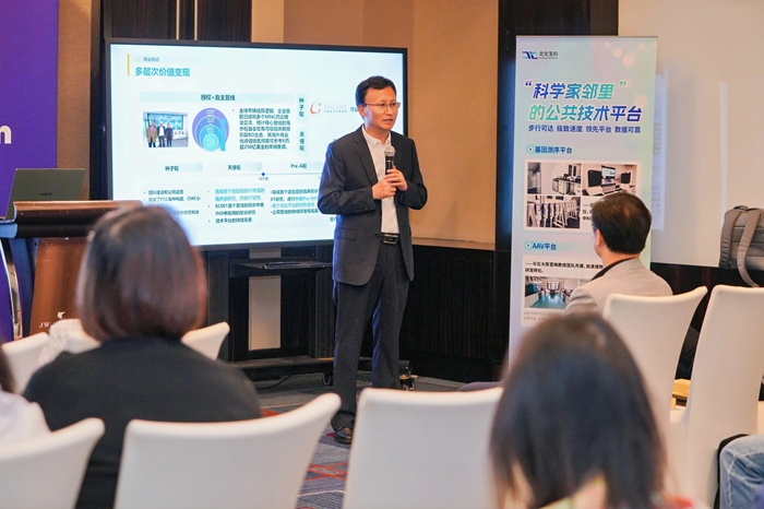 論壇中,北化生科黨總支書記、總經理申海成從專業運營空間、專業運營團隊和專項產業基金等多個方面,深度聚焦以核酸藥物為代表的五大細分賽道,向與會者詮釋“國際生物島”獨有的“1公里科學家鄰里”生態,并通過高標準技術平臺、專項基金、技術審評、專屬空間、高科技人才和公共服務六大生態要素協同,系統闡釋從“0-1-N”的產業化路徑。